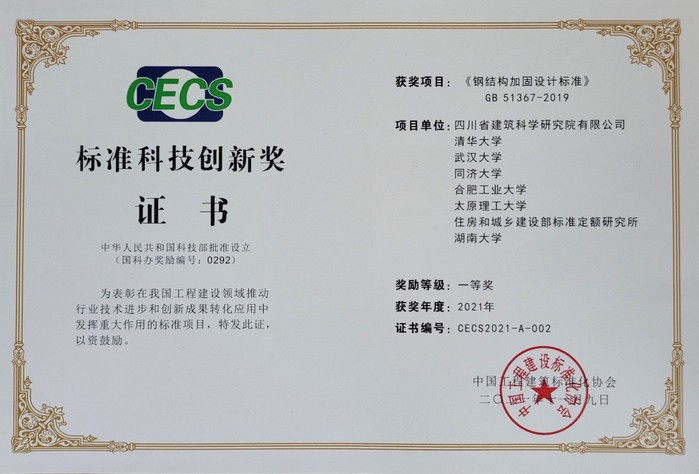 3003新葡平台登录入口完海鹰教授、陈安英副教授参加编制的国家标准《钢结构加固设计标准》(GB 51367-2019)喜获“标准科技创新奖”项目一等奖。该国家标准在我国工程建设领域推动了行业技术进步和创新成果转化应用中发挥了重大作用。