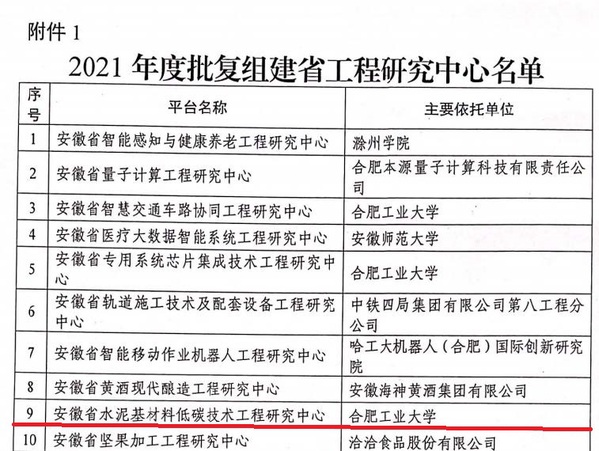 近日,安徽省发展和改革委员会发布“2021年度安徽省工程研究中心评审结果公示”,其中新葡官网申报的安徽省水泥基材料低碳技术工程研究中心获批。