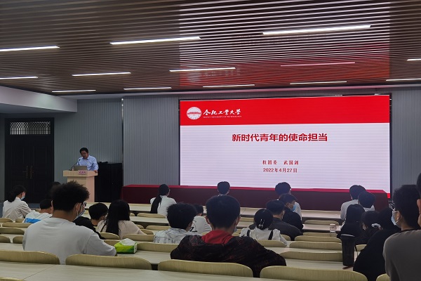 之后由校团委书记、学工部副部长武国剑老师为全体学员讲授了题为《新时代青年的使命担当》的主题团课。武书记以中国媒体网络流行语开篇,阐明中国特色社会主义进入新时代的重大意义,以“什么是青年担当、青年为什么要担当、青年怎样来担当”三个问题深入阐释了青年与国家、与中国共产党之间的关系,结合生动的故事和实例精彩地讲述了不同时期青年运动的开展、新时代中国青年的担当作为、习近平总书记对青年的寄语,引人入胜,发人深省。
