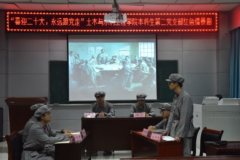 “砼”心演绎,青春向党。103日,学院本科生第二党支部在纬地楼515室以“喜迎二十大,永远跟党走”为主题开展了“遵义会议”红色情景剧展演活动。演出最后,全体师生挥舞国旗,齐声合唱《我和我的祖国》,向祖国母亲致以崇高的敬意和真挚的祝福。